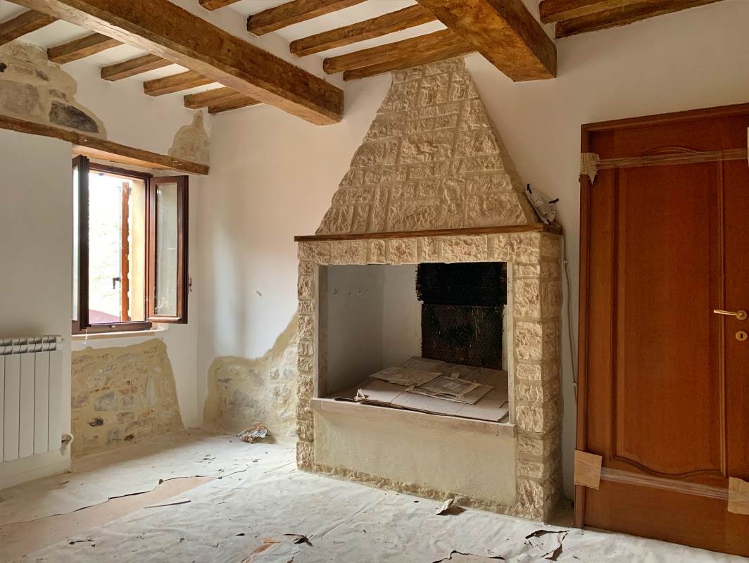 The interiors are characterized by charming exposed stone walls, lending a rustic and authentic atmosphere typical of Umbrian country homes. The kitchen features terracotta flooring, perfect for maintaining warmth and the traditional charm of the house, while the upper bedrooms are finished with elegant and practical laminate flooring.