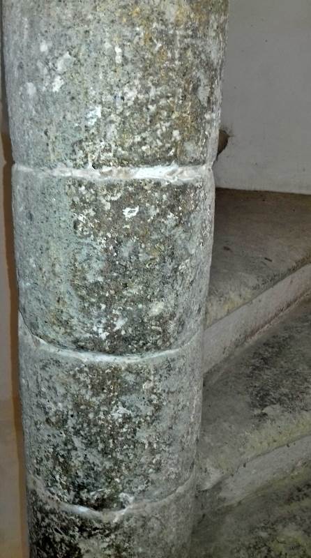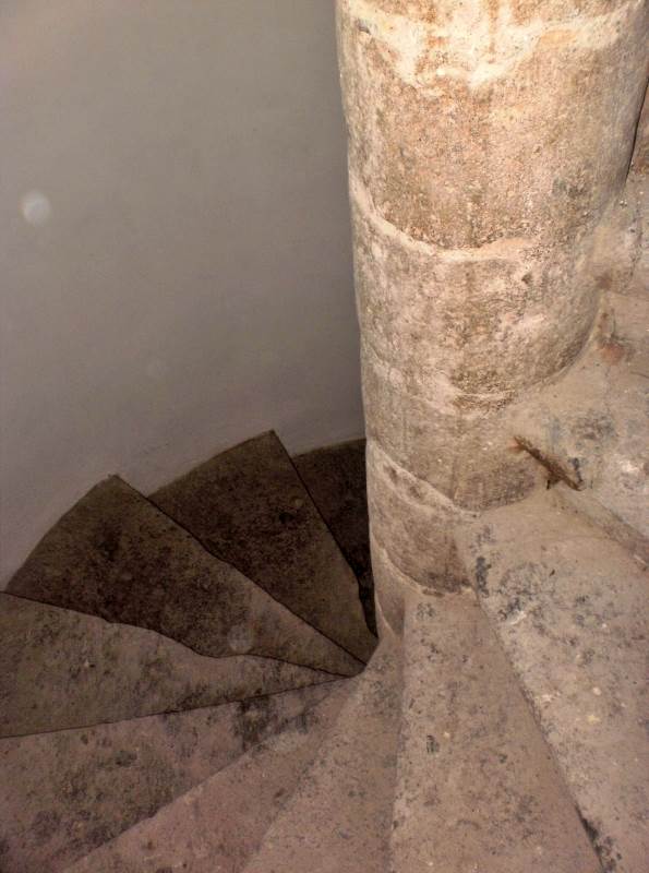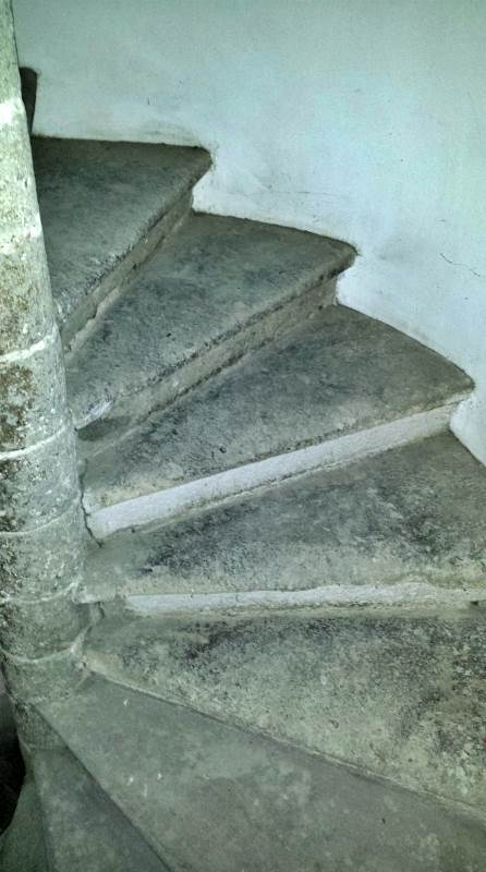 An impressive medieval spiral staircase in peperino and basalt stone connects the levels, with original 14th-century steps still in place.