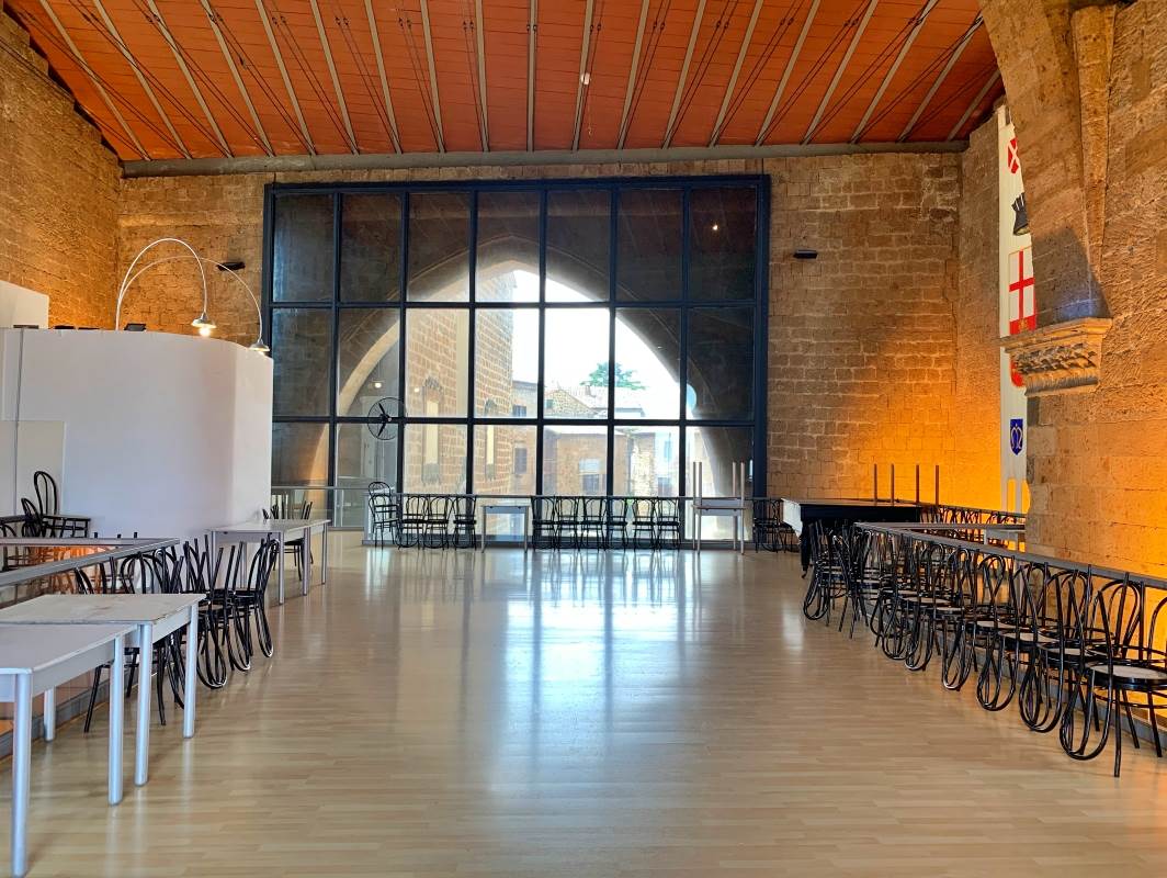 Uno degli elementi più spettacolari di questa struttura è il grandissimo giardino panoramico situato a ridosso della rupe di Orvieto. Questo spazio all'aperto offre una vista mozzafiato sulla valle sottostante, creando un ambiente incantevole per ogni evento. Che si tratti di una cerimonia nuziale al tramonto, di una festa sotto le stelle, di un concerto all'aperto o di una cena elegante, il giardino panoramico aggiunge un tocco di magia e unicità all'esperienza.